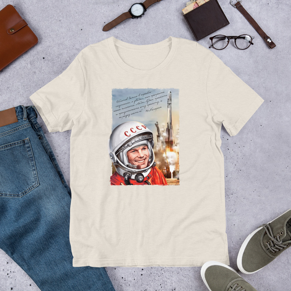 Camiseta con Yuri Gagarin, el primer cosmonauta en el espacio. Contiene su cita «Al rodear la Tierra en una nave espacial, vi lo hermosa que es nuestra planeta. ¡Gente, preservemos y multipliquemos esta belleza, no la destruyamos!»